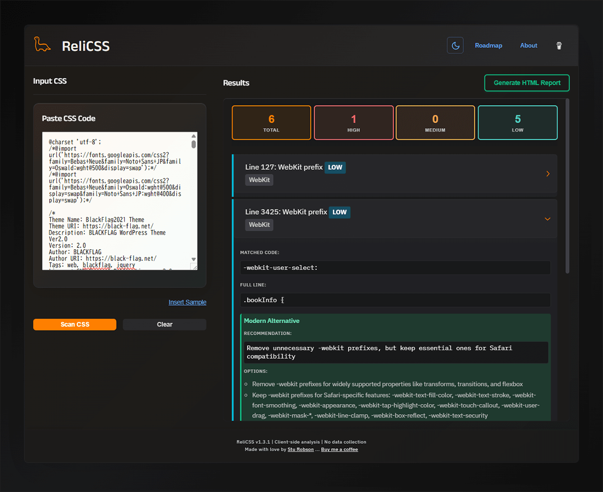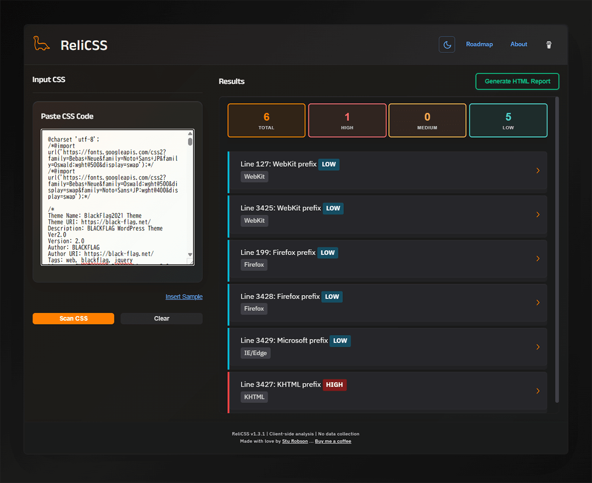 ReliCSSはCSSハック検出ツールとして、古いブラウザ固有のCSSハックを特定して、最新の標準に準拠した代替案に置き換えるのを支援するために設計されています。